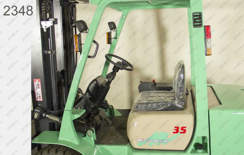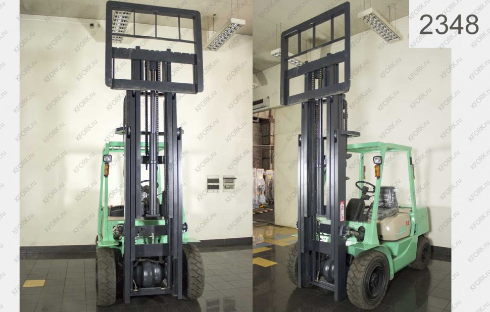 Дизельный автопогрузчик Mitsubishi Б/У с интентарным номером 2348 1997 года выпуска. Состояние - Хорошее. Имеет грузоподъемность 3500 кг. Гарантия: 1 мес или 200 м/час.