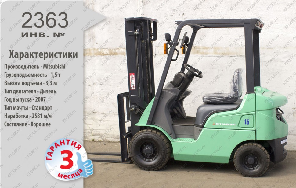 Дизельный автопогрузчик Mitsubishi Б/У с интентарным номером 2363 2007 года выпуска. Состояние - Хорошее. Имеет грузоподъемность 1500 кг. Гарантия: 3 мес или 500 м/час.
