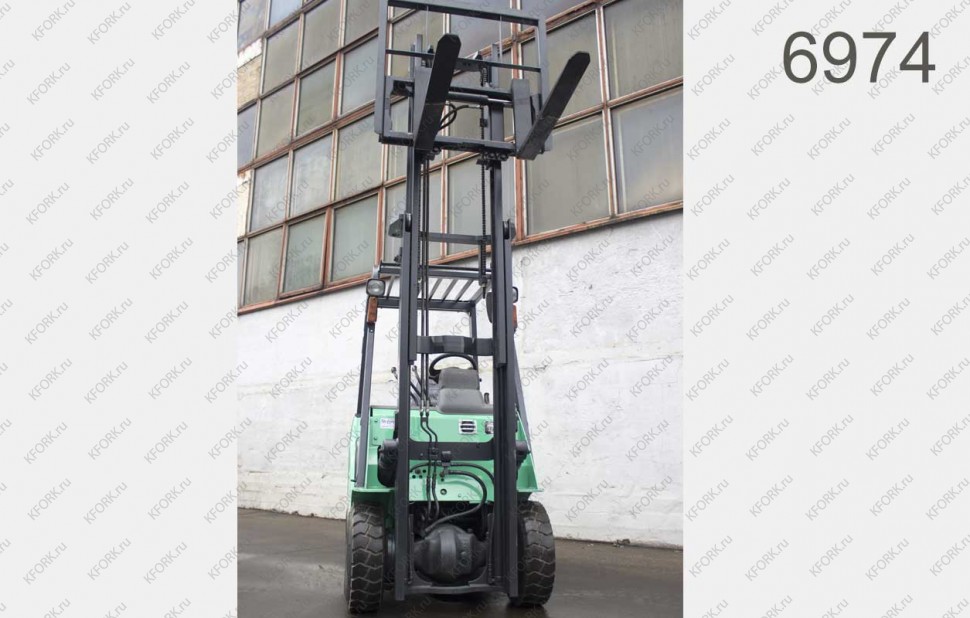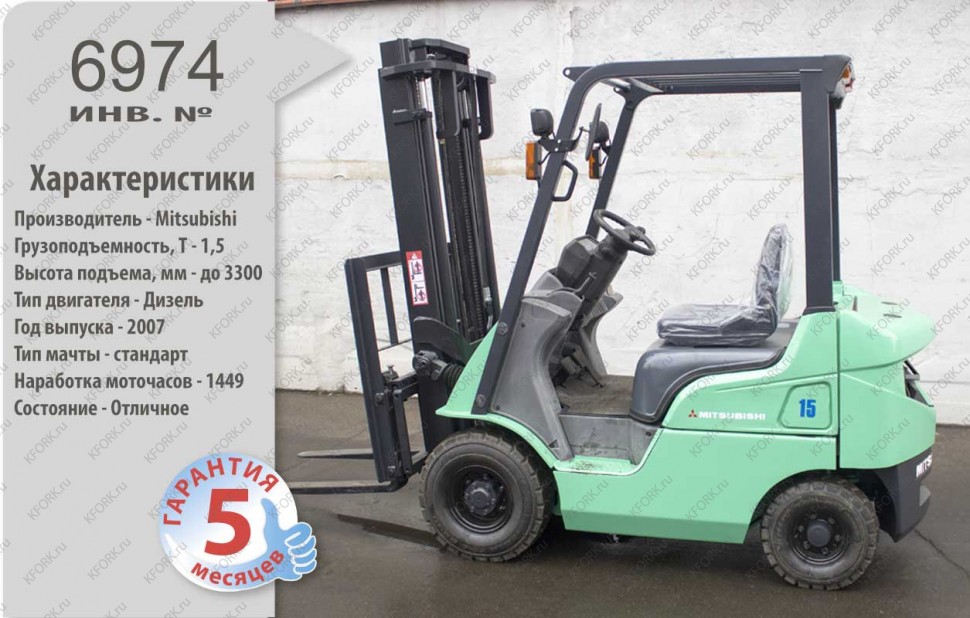 Дизельный автопогрузчик Mitsubishi Б/У с интентарным номером 6974 2007 года выпуска. Состояние - Отличное. Имеет грузоподъемность 1500 кг. Гарантия: 6 мес или 800 м/час.