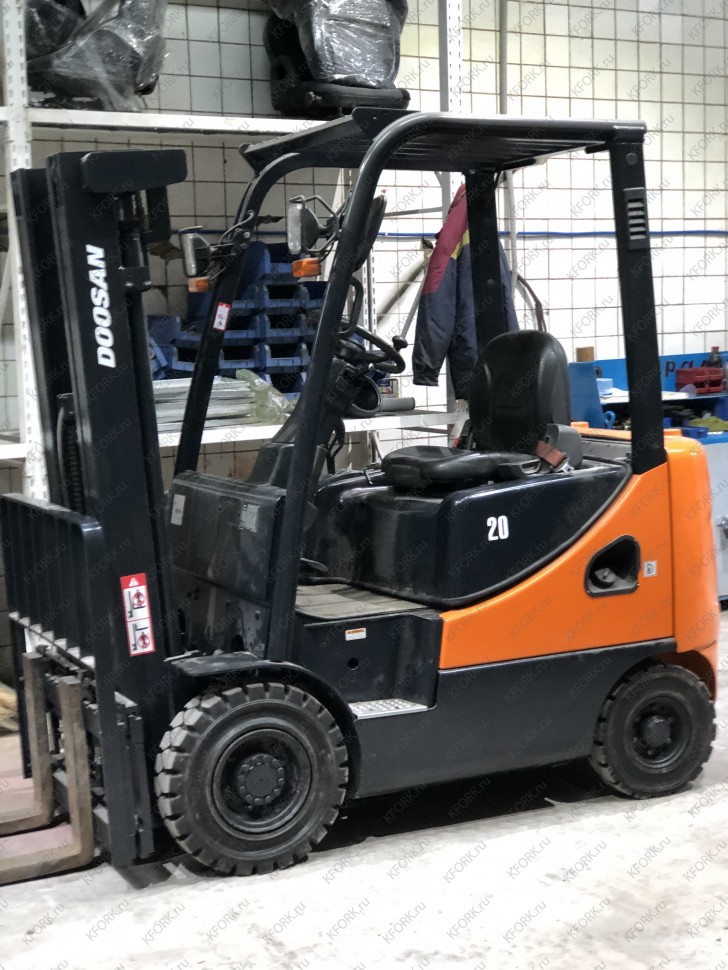 Дизельный автопогрузчик Doosan D20SC-5 с инвентарным номером КМ049 2013 года выпуска. Имеет грузоподъемность 2000 кг. Гарантия: 3 мес или 500 м/час.
