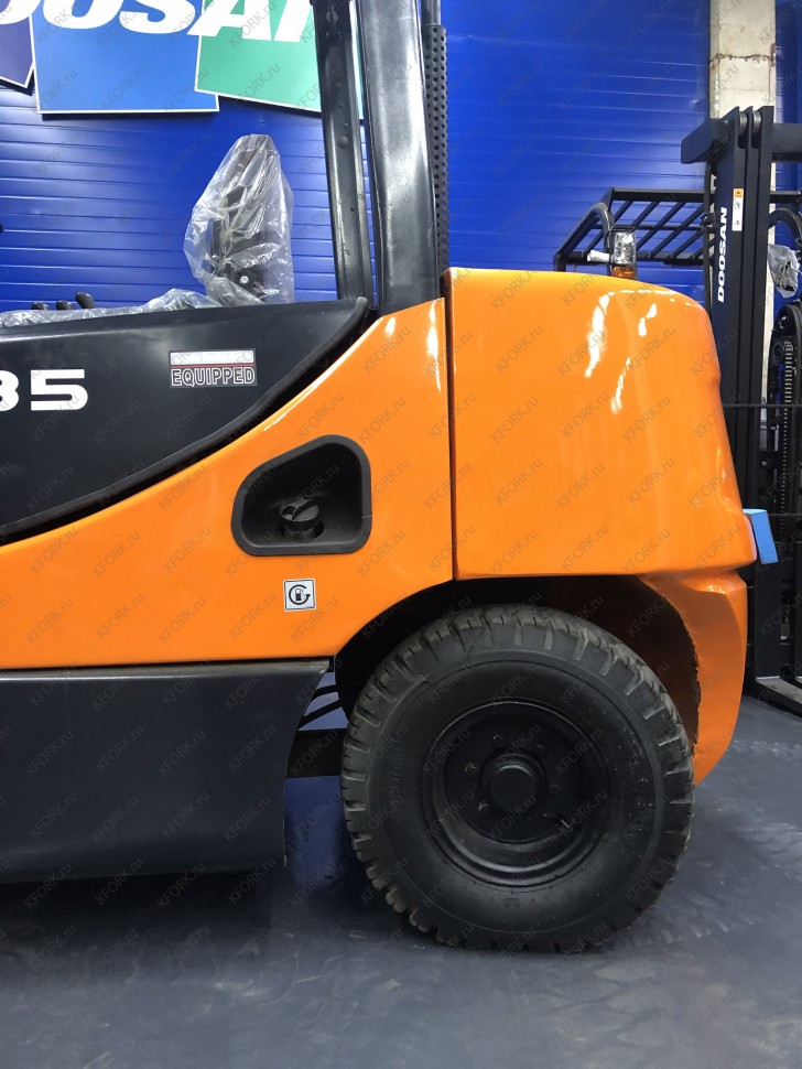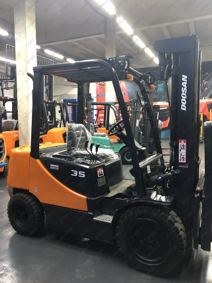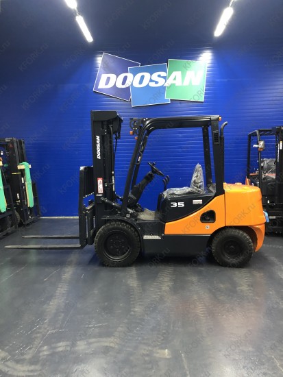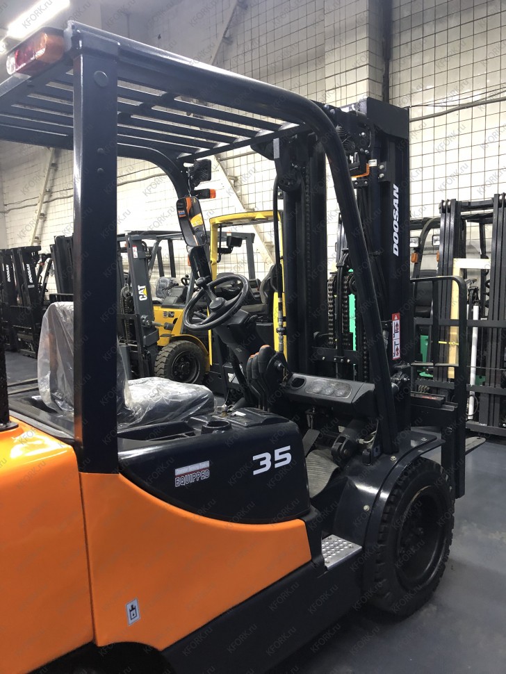 Дизельный автопогрузчик Doosan D35C-7 с инвентарным номером КМ098 2018 года выпуска. Имеет грузоподъемность 3500 кг. Гарантия: 3 мес или 500 м/час.