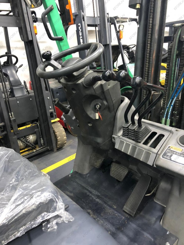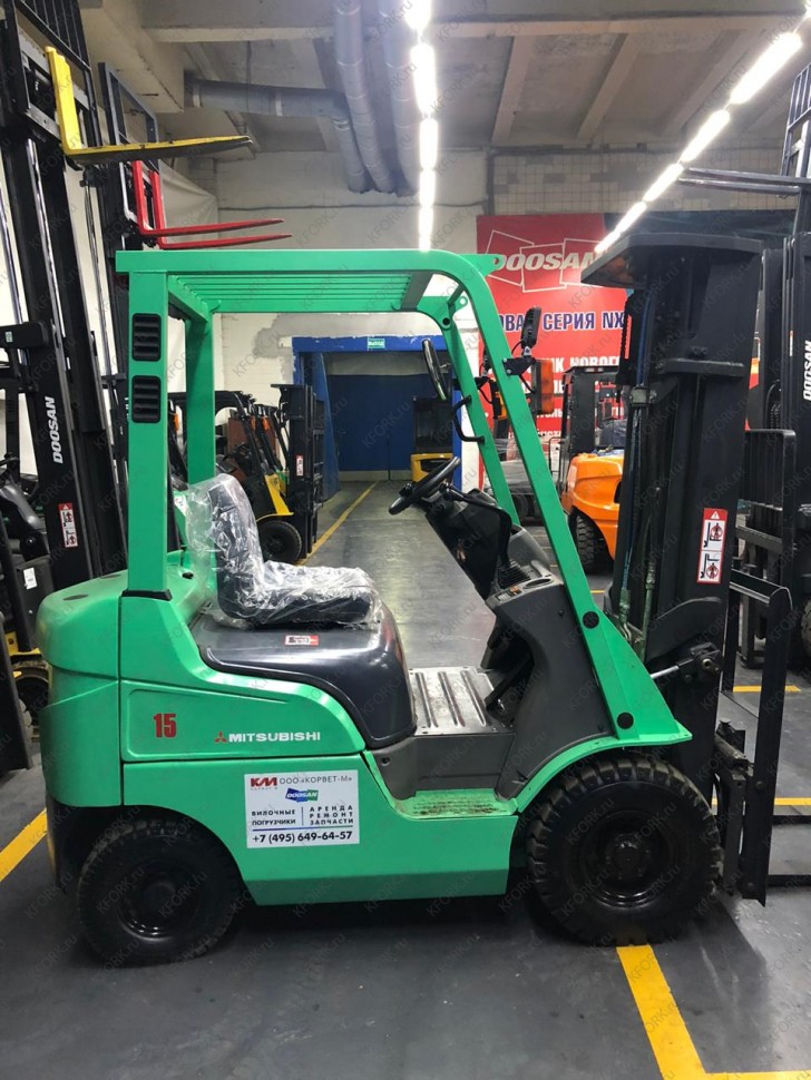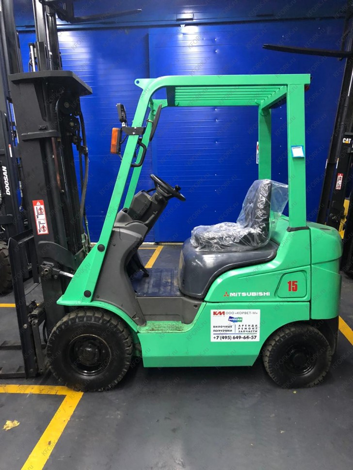 Дизельный автопогрузчик Mitsubishi FD15NT с инвентарным номером КМ117 2012 года выпуска. Имеет грузоподъемность 1500 кг. Гарантия: 3 мес или 500 м/час.