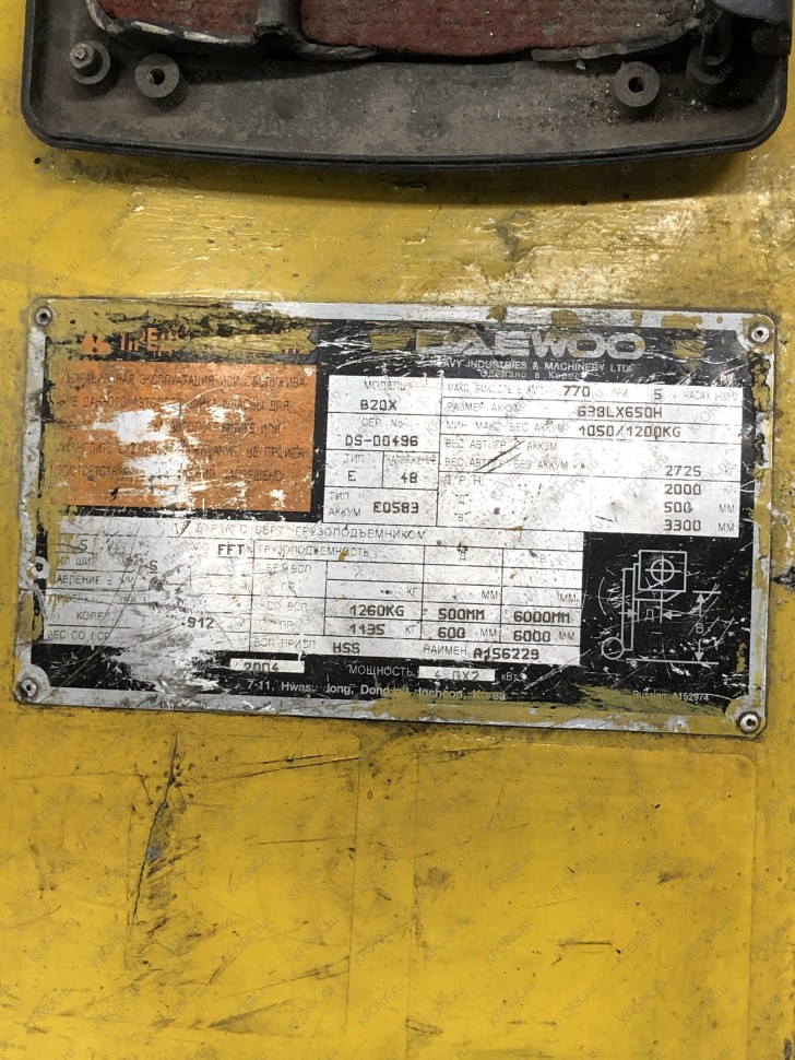 Электрический электропогрузчик Daewoo B20X с инвентарным номером КМ063 2004 года выпуска. Имеет грузоподъемность 2000 кг. Гарантия: 1 мес или 200 м/час.