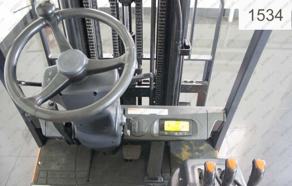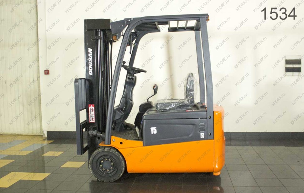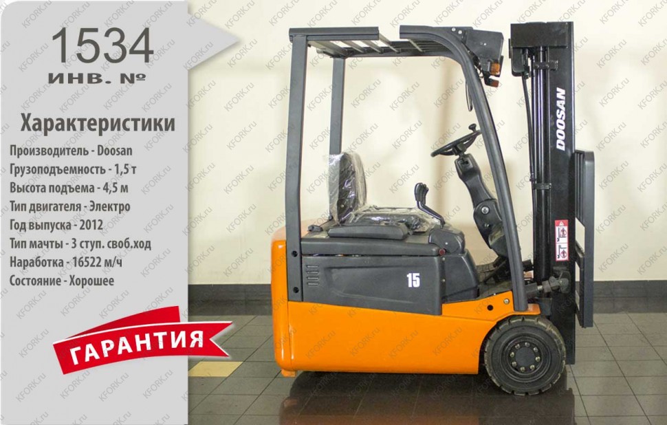 Электрический погрузчик Doosan Б/У с интентарным номером 1534 2012 года выпуска. Состояние - Хорошее. Имеет грузоподъемность 1500 кг. Гарантия: 1 мес или 200 м/час.
