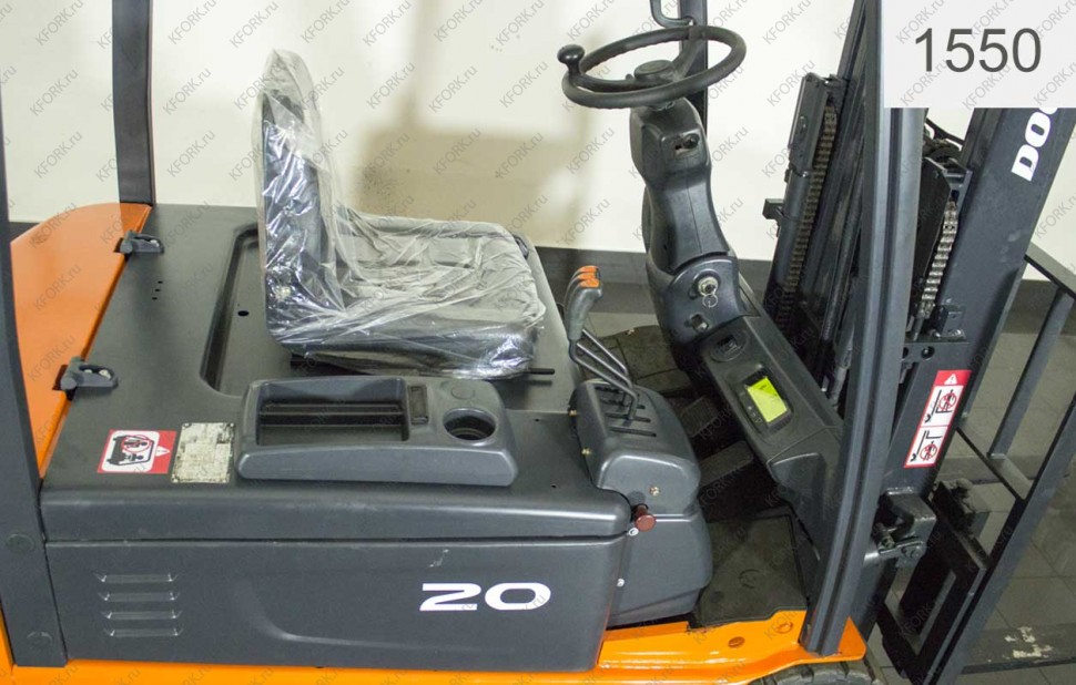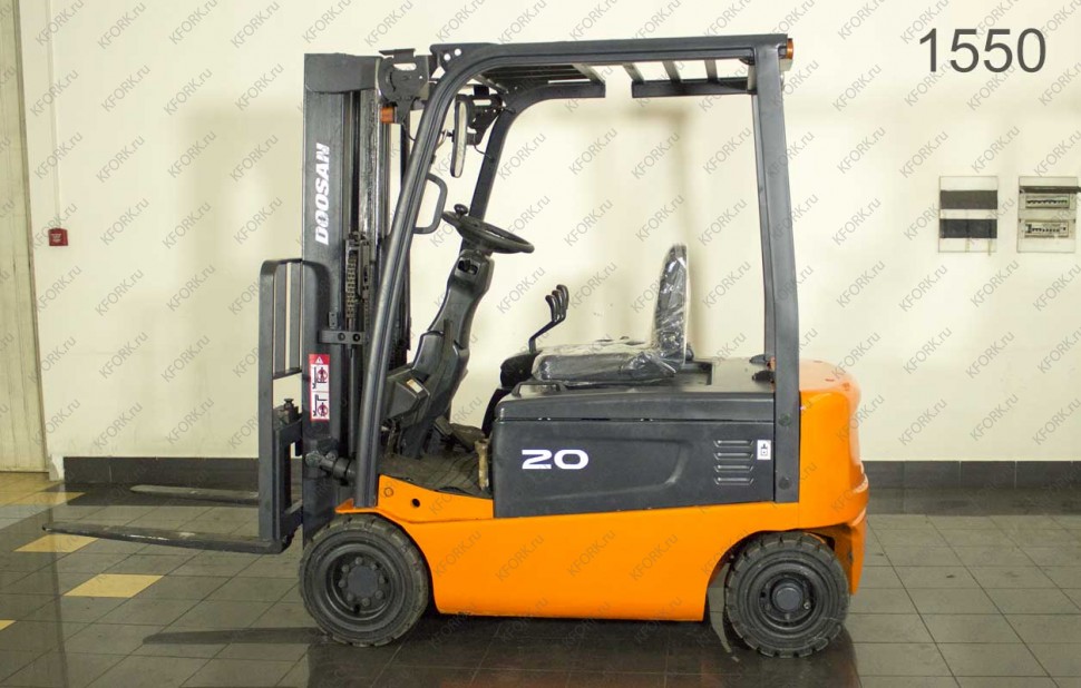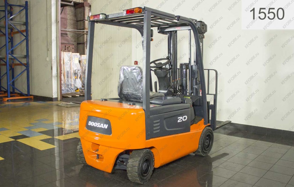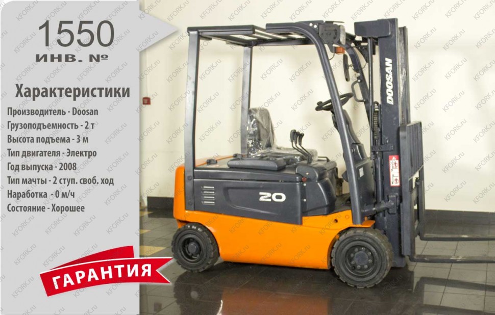 Электрический погрузчик Doosan Б/У с интентарным номером 1550 2008 года выпуска. Состояние - Хорошее. Имеет грузоподъемность 2000 кг. Гарантия: 1 мес или 200 м/час.